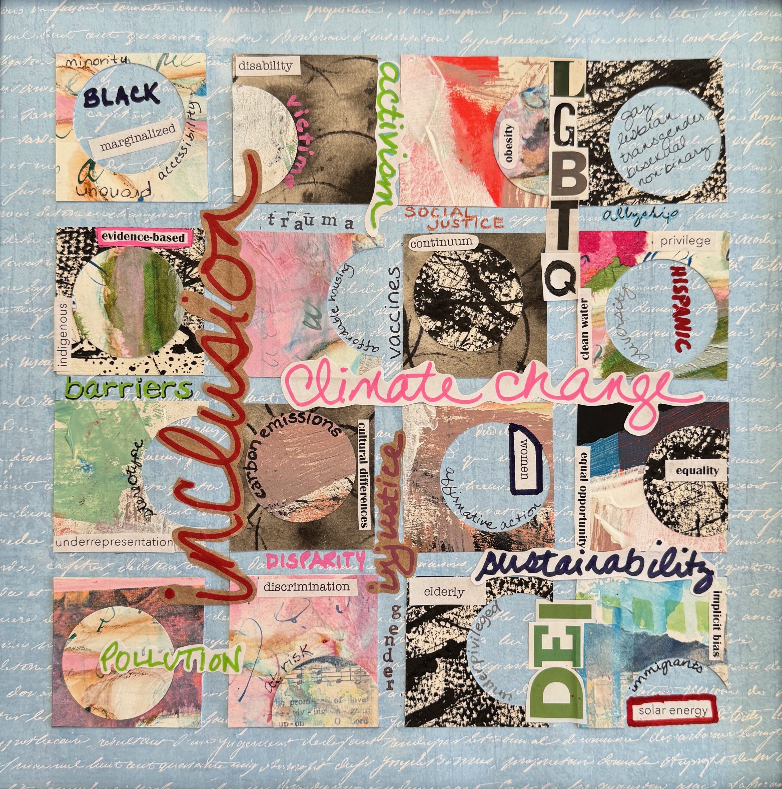 Words are a very old feature of art. Recall ancient hieroglyphics and illuminated manuscripts. It might be said that our words grew out of the creation of art, even as words and art seemed to diverge many millennia in the past. Words returned to the canvass in the early 20th century when artists like Picasso and Braque incorporated letters and words from periodicals or labels into their paintings. The use of words exploded with the development of conceptional art when the idea behind the art began to have greater meaning. Pop Art took the use of language, from Brillo pad boxes and Campbell Soup cans, to another level. And today artists push boundaries by projecting words into paintings and photographs and even on to the sides of buildings. Street artists, too, rely heavily on text to amplify their works.