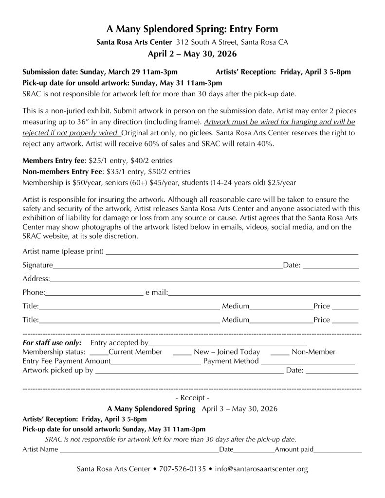 The Santa Rosa Art Center welcomes the new season with “A Many Splendored Spring.” Art for the show will focus on the stunning revival of life and light that underpins a new season of rebirth and growth, changing colors and forms.